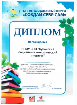 | Грамота Министерства образования и науки Краснодарского края по итогам проведения 13-го образовательного форума "Создай себя сам" |